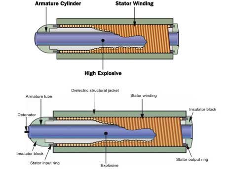 پس از به وجود آمدن میدان مغناطیسی درون سیلندر حاوی مواد منفجره این مواد توسط جریان القایی از سوی میدان مذکور شروع به منفجرشدن میکنند و موج انفجار کمکم تمام سیلندر را فرامیگیرد و در سر راه خود بقیه مواد منفجره را منفجر میکند.