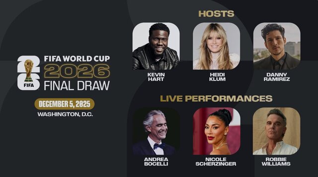 به گزارش قلم آزاد، فیفا با اعلام جزئیات مراسم قرعهکشی جام جهانی ۲۰۲۶، صحنهای ستارهساز را در واشنگتن تدارک دیده است. هایدی کلوم و کوین هارت به عنوان مجریان اصلی انتخاب شده اند و آندرهآ بوچلی، رابی ویلیامز و نیکول شرزینگر اجرای زنده خواهند داشت.